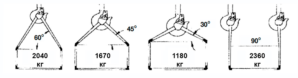 На практике это означает, что точки зацепа на грузе не должны быть слишком далеко друг от друга относительно длины строп. Расстояние между точками зацепа не должно превышать высоту подъема до места схождения — тогда угол будет около 90° или меньше.